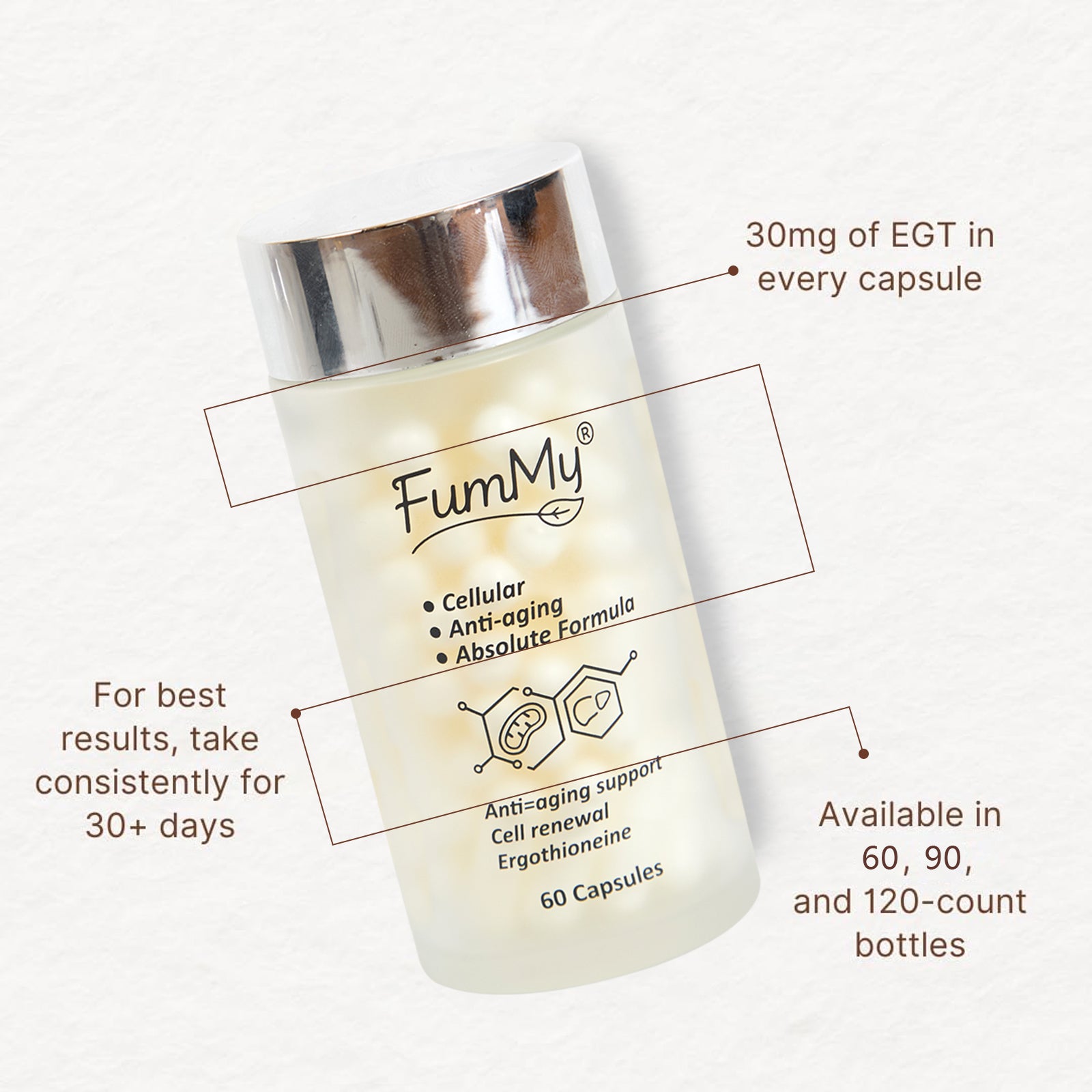 Fummy L-Ergothioneine 60 capsules per bottle Cellulare Anti-aginge Absolute Formula Anti-aging support Cell renewal, Ergothioneine Heart Health & Brain Supplement Lab Tested Made in USA 0.5mg/cps. (120 pcs)